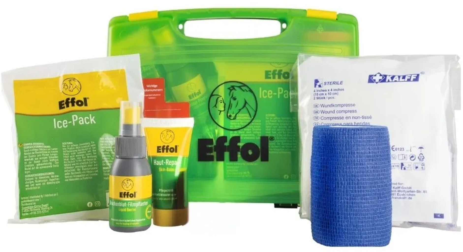 Ce kit pratique contient tout ce dont vous avez besoin pour les premiers soins du cheval et du cavalier. Des produits indispensables dans l'écurie ou en sortie. Tous les produits et accessoires importants sont toujours à portée de main en cas d'accident.