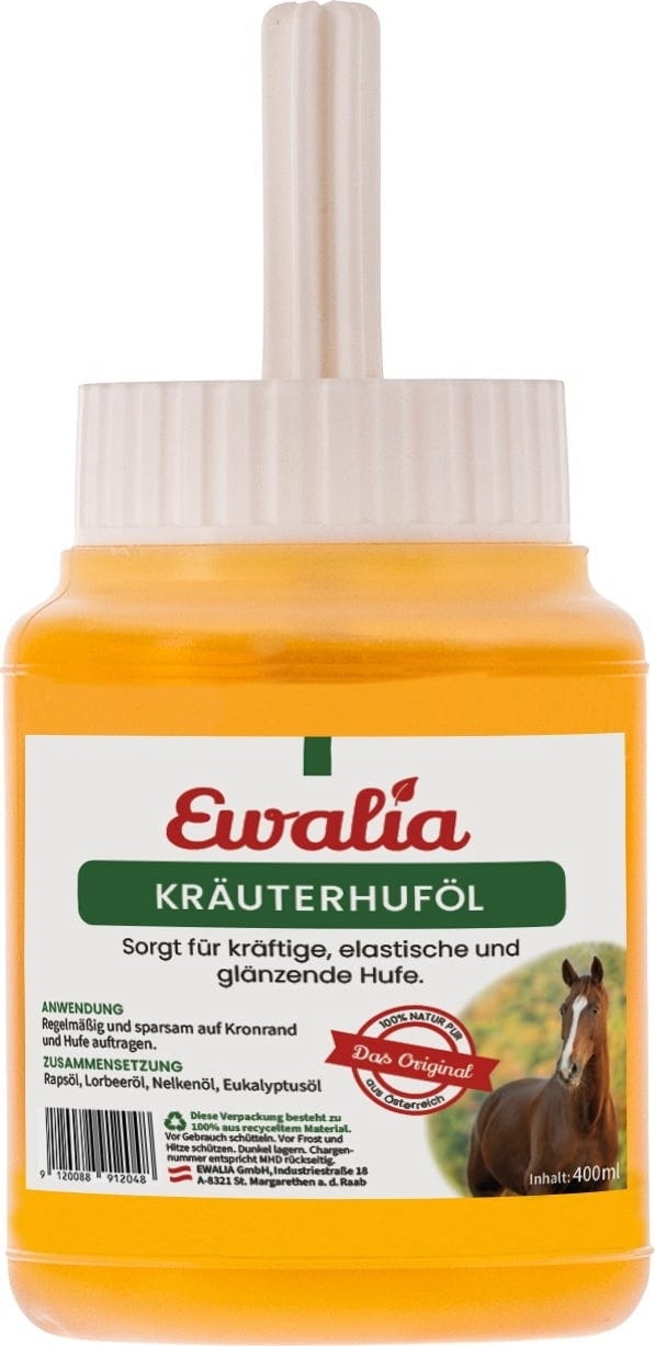 L'huile aux herbes pour sabots EWALIA assure des sabots solides, élastiques et brillants.