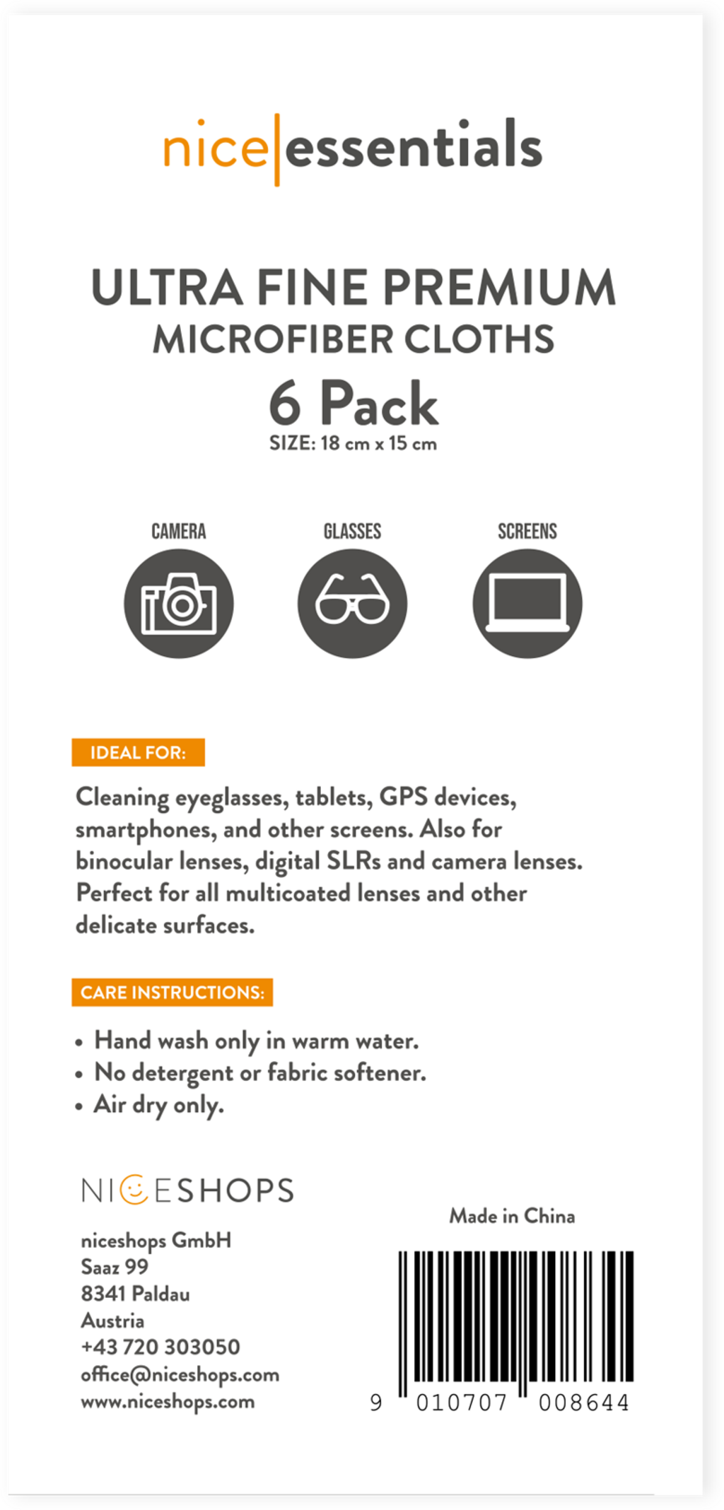 Les chiffons de nettoyage en microfibre ultra fine de nice essentials sont parfaits pour nettoyer en douceur les surfaces sensibles comme les lunettes, écrans ou objectifs d’appareil photo. Leur microfibre hautement tissée attire efficacement la poussière, les impuretés et les traces de gras, sans rayer ni laisser de peluches.