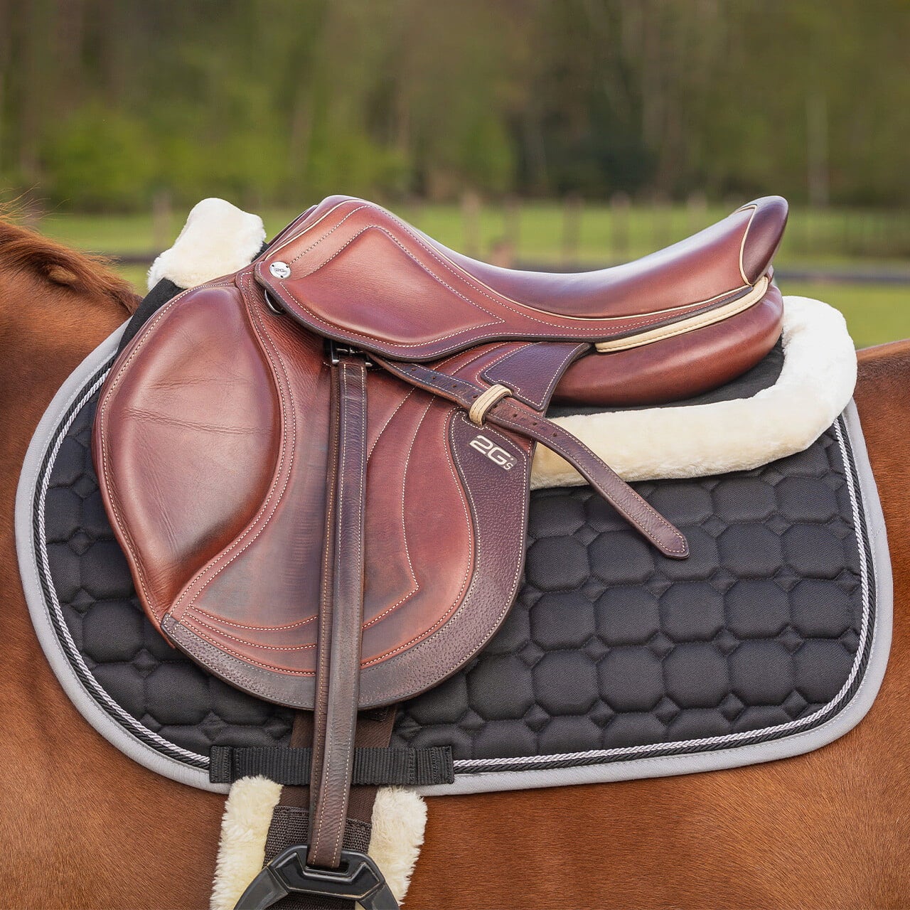 - Bordure douce en fausse fourrure : au niveau du garrot et le long du bord arrière, un empiècement en fourrure synthétique protège des frottements et confère à l’amortisseur une allure élégante.