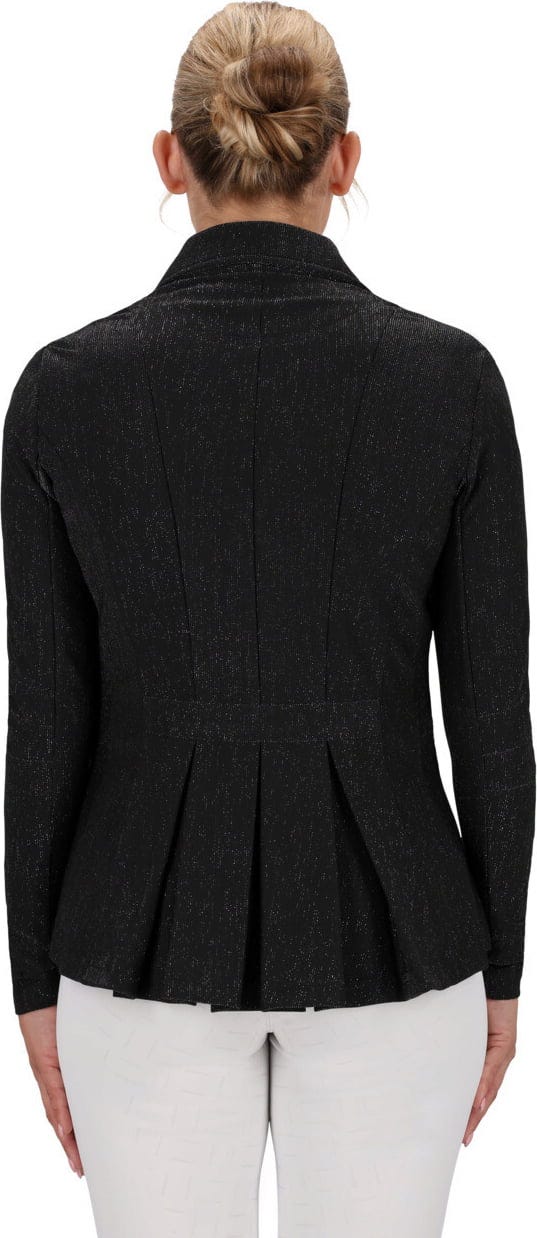 La fermeture éclair dissimulée sous la patte de boutonnage est un détail particulièrement ingénieux. Elle permet au devant de rester bien en place au galop ou à l’obstacle, sans tension ni ouverture inesthétique. Visuellement, les discrets détails en strass sur le col et le fin liseré contrastant apportent une touche raffinée sans excès. Cette coupe sportive met en valeur la silhouette dans le carré de dressage comme sur le parcours d’obstacles, tout en garantissant une liberté de mouvement optimale au niveau du dos pour des performances maximales.