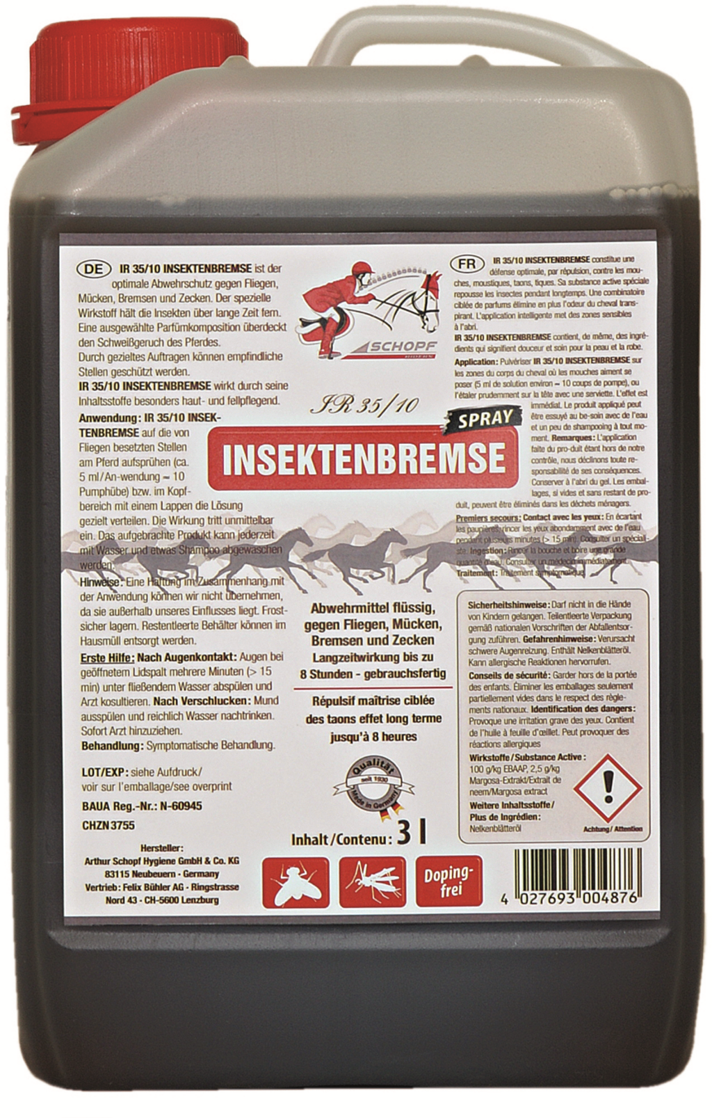 Pour les chevaux à passeport équin, IR 35/10 est le produit idéal contre les mouches, les taons et les moustiques. Ses substances actives spéciales tiennent les insectes à l'écart pendant de nombreuses heures.