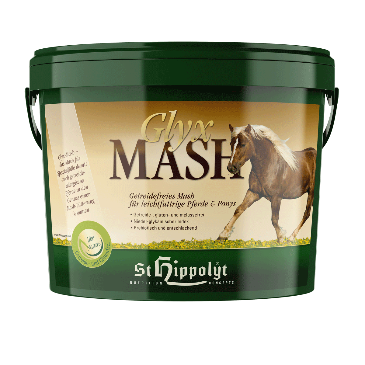 Les friandises comme les pommes, les carottes et le pain peuvent sembler saines et nutritives à première vue, mais même ces aliments cachent souvent des quantités importantes de sucre et d'amidon. Le Glyx-Mash pratique de St.Hippolyt offre une alternative pauvre en sucre et en amidon, sans céréales, gluten ni mélasse. Ce mash particulièrement adapté aux chevaux sensibles aux céréales et allergiques, est une riche composition d'ingrédients prébiotiques, d'herbes sélectionnées et est enrichi, entre autres, de graines de lin broyées.