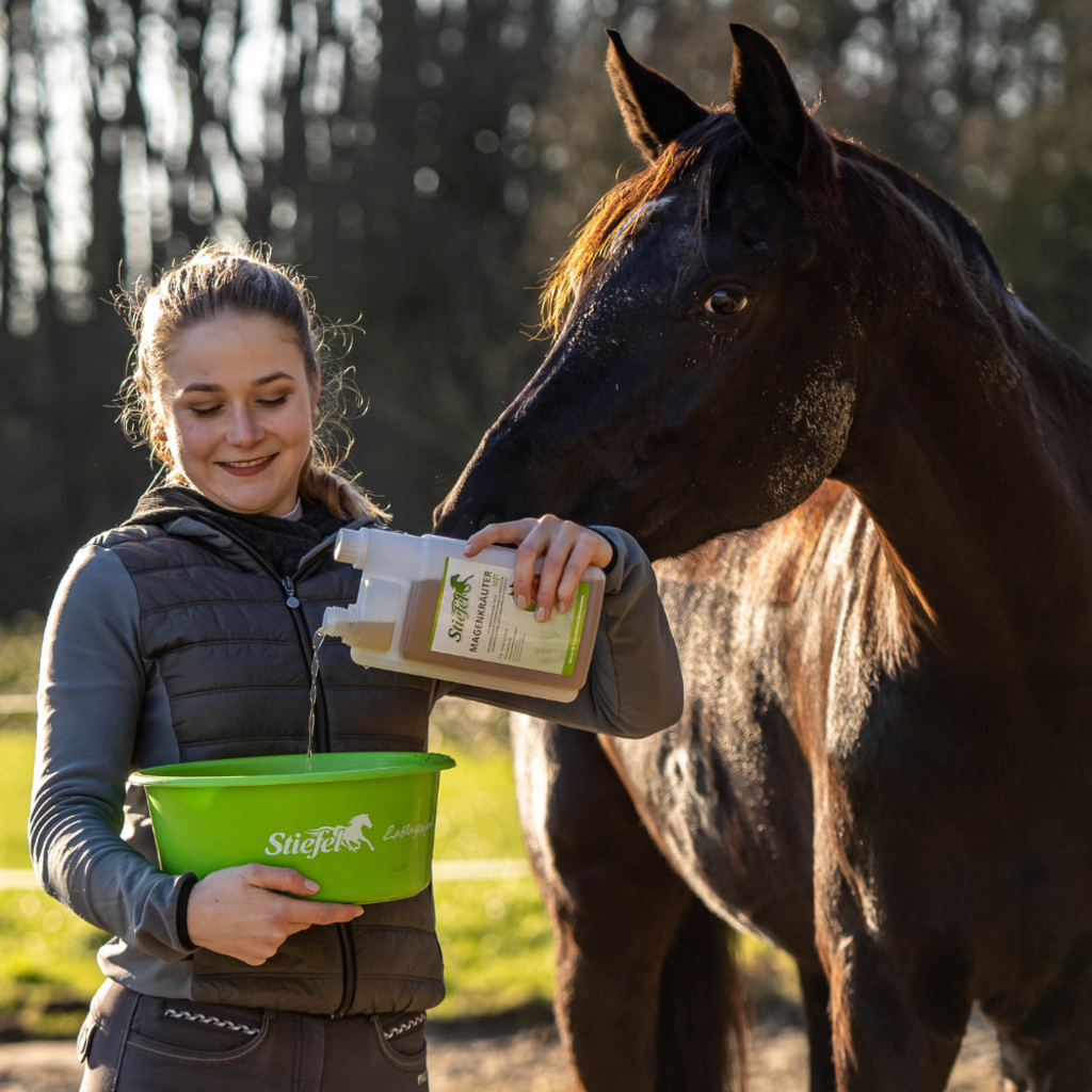 Ce complément alimentaire liquide Stiefel est élaboré à partir d'un mélange 100% naturel d'herbes, sans arômes artificiels. Il peut aider à réguler la digestion du cheval et avoir un effet positif sur les ballonnements, les crampes d'estomac, la constipation ou la diarrhée.