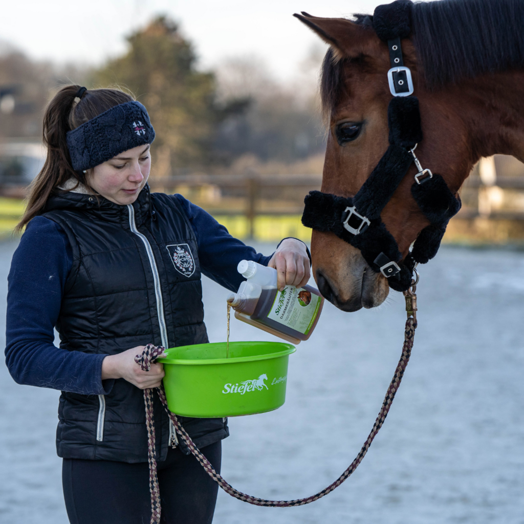 Ce complément alimentaire liquide Stiefel est élaboré à partir d'un mélange 100% naturel d'herbes, sans arômes artificiels. Il peut aider à réguler l'ensemble du tractus gastro-intestinal chez les chevaux et a un effet positif sur les flatulences, les crottins liquides, la diarrhée et les tendances aux coliques.