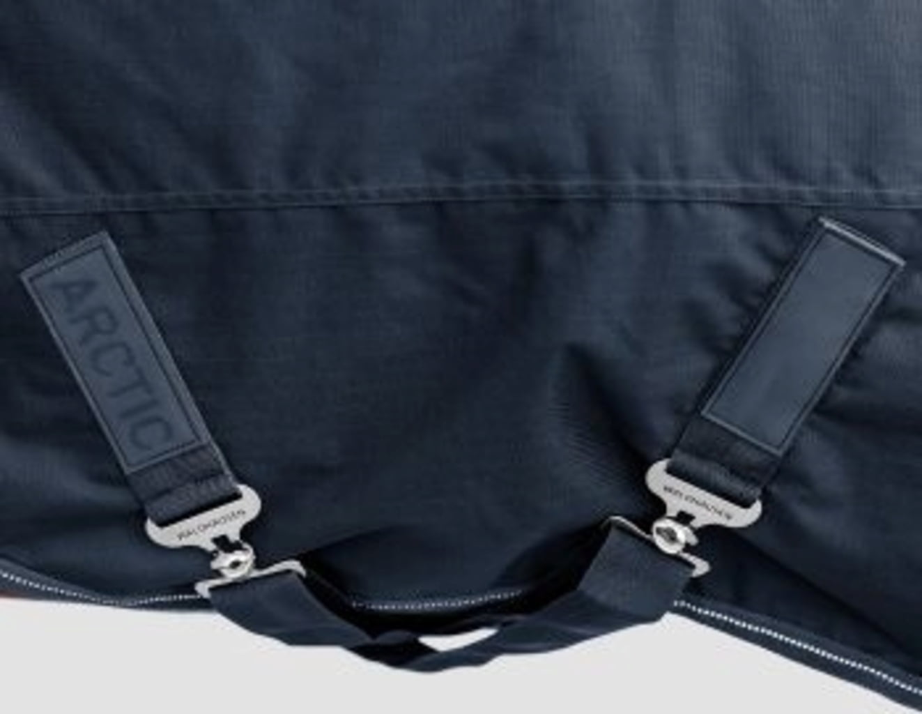 La coupe High Neck constitue un véritable atout. Conçue pour se positionner plus haut sur l’encolure, elle protège les zones sensibles telles que le garrot et la crête de la crinière contre les frottements. En parallèle, le large pli d’aisance garantit une liberté de mouvement totale, que le cheval joue, mange ou se repose. À l’intérieur, la couverture est dotée d’une doublure antibactérienne pour un confort optimal. Avec son garnissage de 200 g, elle offre une isolation thermique agréable lors des journées plus fraîches – et lorsque les températures baissent davantage, la couverture Arctic peut être facilement combinée avec une sous-couverture adaptée grâce au système de fixation Clip-In. Une flexibilité idéale pour faire face à toutes les conditions météorologiques.