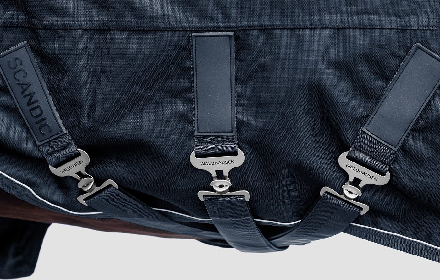 La coupe est soigneusement étudiée : la fermeture frontale pratique en V assure un maintien stable et, associée aux trois sursangles ventrales, empêche les glissements gênants. Une grande fente d’aisance garantit en permanence une liberté de mouvement optimale. Pour encore plus de flexibilité en hiver, la couverture est équipée de boucles de fixation permettant d’ajouter à tout moment un couvre-cou disponible séparément. Elle dispose également d’un rabat de queue extra-large, tandis que le liseré réfléchissant assure une excellente visibilité au crépuscule.