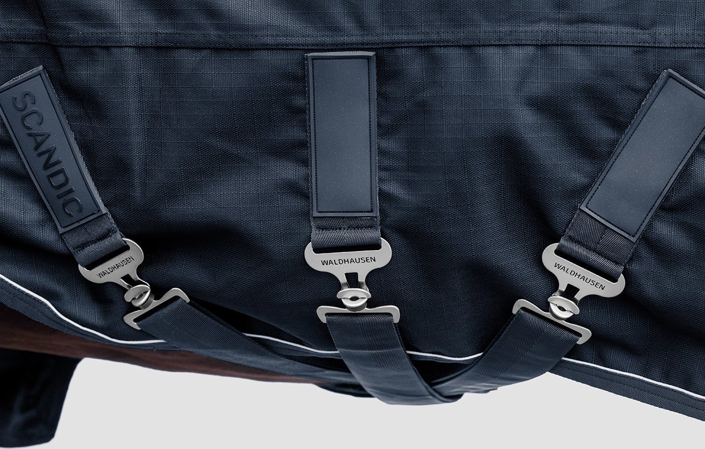 La coupe est soigneusement étudiée : la fermeture frontale pratique en V garantit un maintien sûr et, associée aux trois sursangles ventrales, empêche efficacement la couverture de glisser. Une grande fente d’aisance assure en permanence une liberté de mouvement optimale. Pour encore plus de flexibilité en hiver, la couverture est dotée de boucles de fixation permettant d’ajouter à tout moment un couvre-cou disponible séparément. Elle est également équipée d’un rabat de queue extra-large, tandis que le liseré réfléchissant assure une excellente visibilité au crépuscule.